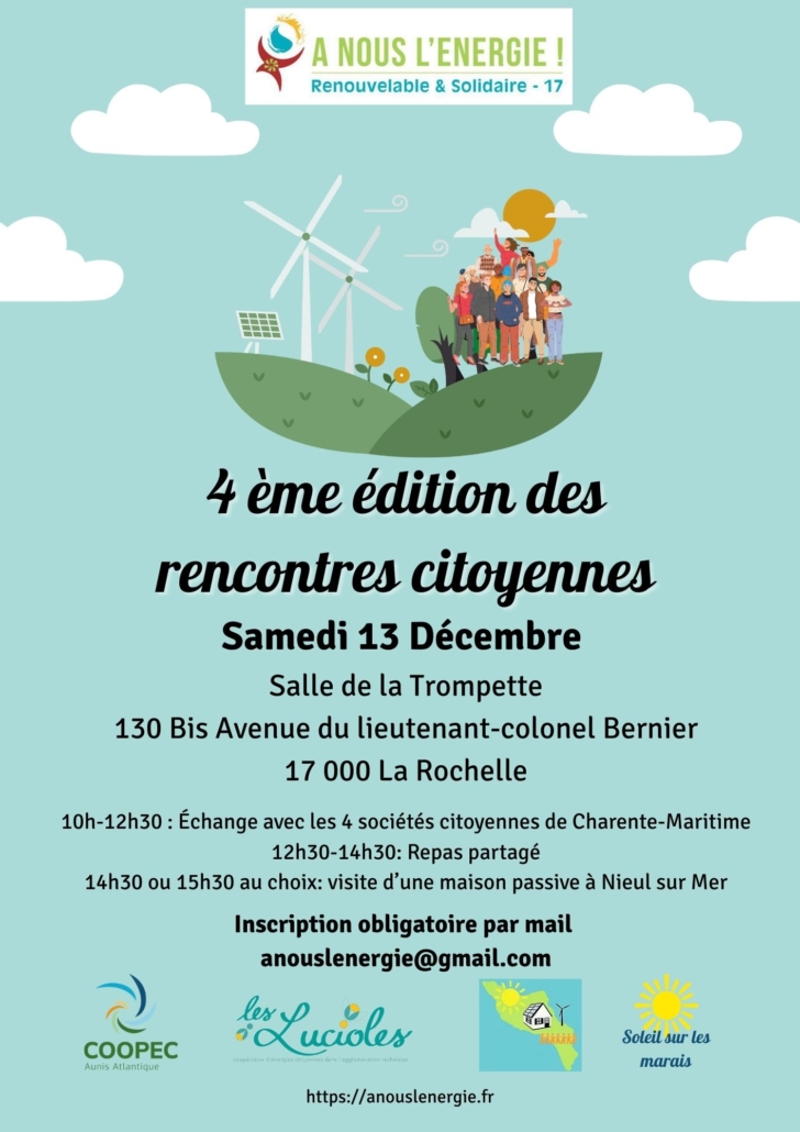Rejoignez nous le 13 Décembre à La Rochelle pour la 4ème édition des rencontres citoyennes. Le matin retrouvez les témoignages des 4 sociétés citoyennes de Charente-Maritime et l’après midi la visite d’une maison passive à Nieul sur Mer. Deux créneaux sont possibles pour la visite, 14h30 ou 15h30. Le midi nous nous retrouverons autour d’un repas partagé.